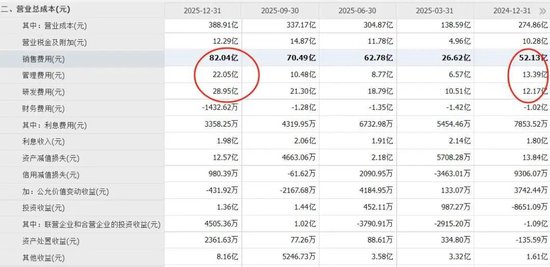 2025年第四季度,赛力斯销售费用、管理费用、研发费用分别录得82亿、22亿及23亿元, 同比增长了58%、68%及137%,均高于营收增速。