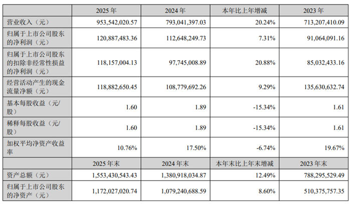 2025 年,公司实现营业收入9.54 亿元,同比增长 20.24%;归属于上市公司股东的净利润1.21 亿元,同比增长 7.31%;扣除非经常性损益后的净利润1.18 亿元,同比增长 20.88%,经营质量持续提升。