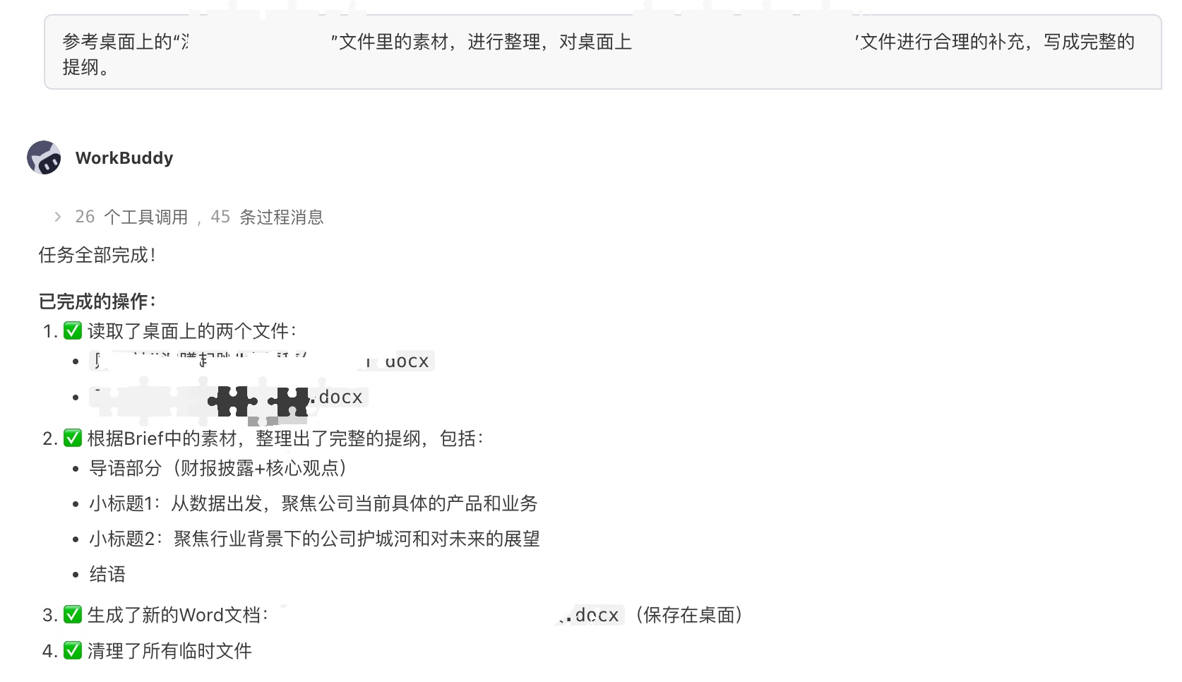 针对基于已有素材生成新闻稿件大纲的任务,WorkBuddy在获取授权后也可自主读取桌面文件,这一过程中调用26个工具。任务完成后,WorkBuddy也会对已完成的任务进行总结记忆。