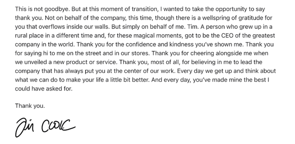 如今在苹果成立的50周年,新一代管理层将陆续浮出水面。对于CEO的交接,在《Community Letter from Tim》这封库克来信中,库克说:“这并不是告别,但在这一重要的过渡时刻,我想借此机会说一声感谢。这一次,不是代表公司,而是仅仅代表我自己,Tim。一个成长于不同时代、来自乡村的人,却有幸在这些充满魔力的岁月里,成为这家世界上最伟大公司的首席执行官。”