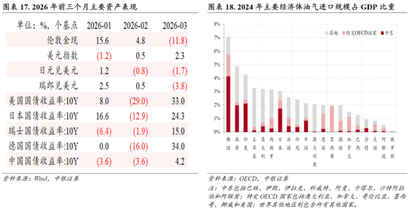 从中国情况看,中国能源消费结构中油气占比较低,且油气进口依存度及对中东油气的依赖程度远低于韩国等经济体(见图表18)。与此同时,近年来我国主要面临有效需求不足、物价持续低迷等问题。在这些因素共同作用下,中东冲突导致的能源价格大幅上涨,对我国经济的直接影响相对有限,人民币资产因而在本轮冲突中展现出较强韧性。3月份,在主要经济体债券收益率明显上行背景下,中债收益率整体维持低波动态势,10年期国债收益率在1.82%附近运行,较2月末仅小幅走高4.2个基点(见图表17)。基于人民币债券同其他主要债券收益率的低相关性,人民币债券被部分市场机构誉为“避险资产”。不过,从人民币债券托管量来看,当月境外机构持有的记账式国债规模较上月减少526亿至1.95万亿元,创下2021年以来新低。这表明,中国国债的稳健表现并非由外资的避险行为驱动。