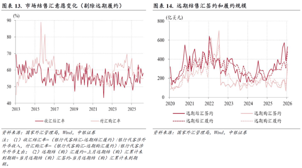 分项目看,证券投资涉外收付款逆差由上月110亿增至532亿美元,为历史次高,货物贸易涉外收付款顺差连续第三个月收窄,由上月678亿降至507亿美元,为2024年7月份以来新低(见图表6),二者分别贡献了银行代客涉外收付款差额降幅的62%、25%;收益和经常转移、直接投资和服务贸易涉外收付款逆差仍然保持相对平稳,环比分别增加58亿、16亿和14亿美元。
