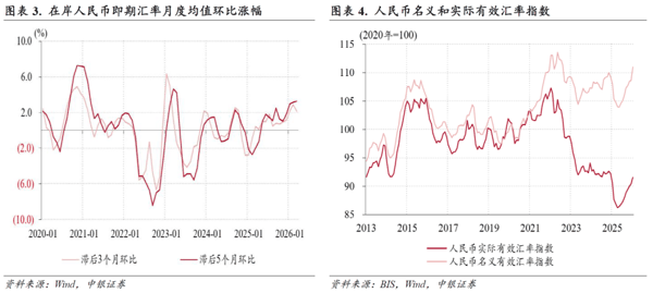 3月份,由于人民币汇率表现明显强于其他主要非美货币,人民币汇率指数延续上月升值态势,且升值速度明显加快,CFETS人民币汇率指数、参考BIS和SDR货币篮子人民币汇率指数累计分别上涨2.3%、2.4%和1.2%,前两者涨幅均创2023年10月以来月度新高。当月,国际清算 银行 (BIS)公布的人民币名义和实际有效汇率指数分别是连续第八个月、第九个月升值,名义有效汇率指数环比上涨2.2%至111.0,为2022年11月以来新高,实际有效汇率指数环比上涨1.2%至91.5,为2025年3月以来新高,较2025年6月低点反弹了6.2%,使得2022年4月以来的人民币实际有效汇率累计跌幅由最多18.9%收敛至14.7%(见图表4)。