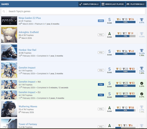 从奖杯网站的记录来看,Tqvry在2023年才首次游玩PS3版《忍龙Σ2》,并在之后两年多的时间里白金了六部《忍龙》,在这个动辄能见到十年骨灰级老玩家的社区里,无疑算是“新人”。