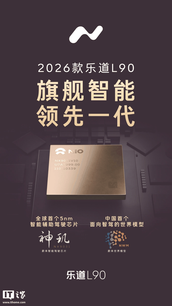 另外,2026 款乐道 L90 确认搭载高阶智能辅助驾驶芯片「神玑 NX9031」与最新版「蔚来世界模型 NWM」。满血版神玑芯片 NX9031 也是业界首款采用 5nm 车规工艺制造的高阶智驾芯片, 自投产以来已经累计出货超 20 万套 。
