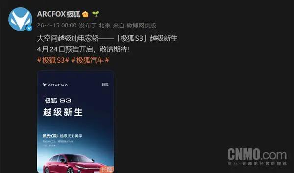 4月15日,北汽新能源旗下品牌ARCFOX极狐宣布,其新款车型“极狐S3”将于4月24日正式开启预售。新车定位中型轿车,共推出纯电、增程、换电三种动力版本。