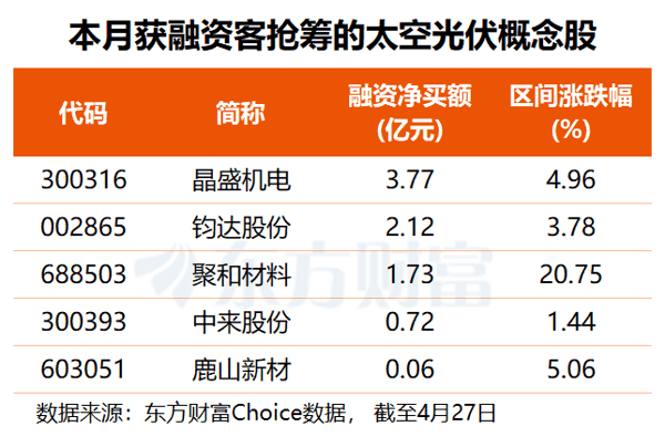 资金方面, 东方财富 Choice数据显示,4月以来,共5只太空 光伏概念 股获得融资净买入,其中, 晶盛机电 获杠杆资金加仓3.77亿元, 钧达股份 、聚合材料分别获抢筹2.12亿和1.73亿元, 中来股份 亦获约7200万元融资净买入。