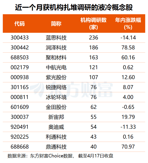 机构关注度方面,近一个月,共有17只液冷概念股获得机构调研, 蓝思科技 以236家机构调研数居首, 润泽科技 、 聚和材料 、 中航光电 、 紫光股份 均获超百家机构扎堆调研, 冰轮环境 、 金田股份 、 新宙邦 等5股亦有超50家机构给予关注。