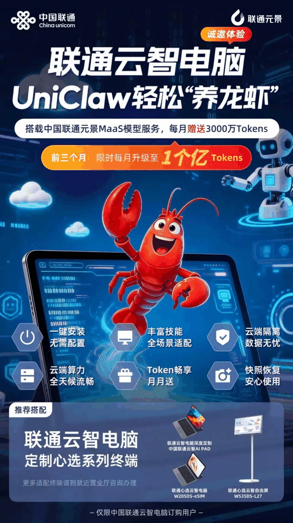 IT之家注意到,中国联通还推出了元景 MaaS 模型服务 + 联通云智电脑 +UniClaw 智能体运行方案,依托联通元景 MaaS 平台模型服务,UniClaw 算力自动就位,全程免配、免调试,一键安装;宣称所有操作与数据均在云端安全环境运行,隔绝本地,本地所有数据,均不被访问、不被篡改。