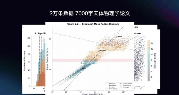 在另一个案例中,Agent 集群将一篇包含大量视觉数据的天体物理论文转化为可复用学术技能,提取论文的推理流程和可视化方法,产出了 40 页、7000 字的研究论文,以及包含 2 万多条数据的结构化数据集和 14 张天文级图表。