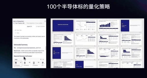例如,该集群针对全球 100 个半导体标的设计并执行了 5 套量化策略,将麦肯锡风格的 PPT 逻辑沉淀为可复用技能,最终交付了详尽的建模表格和整套汇报演示文档。