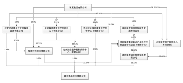 智度惠信与智度德广分别持有深圳智度国光投资发展有限公司(下称“智度国光”)81.32%、18.68%股份,智度国光直接持有国光电器11.22%股份,为国光电器第一大股东。