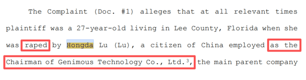 起诉状显示,原告为一名27岁女性,居住在佛罗里达州,控诉被中国公民Hongda Lu强奸(raped)。Hongda Lu系 Genimous Technology Co., Ltd.董事长,后者为三名被告的母公司。