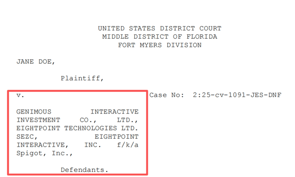 记者从U.S. District Court for the Middle District of Florida(美国佛罗里达州中区地方法院)官网获悉,一份签署日期为2026年2月的裁判文书显示,原告Jane Doe于2025年11月提起诉讼,起诉Genimous Interactive Investment Co., Ltd.(以下简称“Genimous Interactive”)、Eightpoint Technologies Ltd. SEZC(以下简称“Eightpoint”)以及 Eightpoint Interactive, Inc.(原名 Spigot, Inc.,以下简称“Spigot”)(下称“被告”),并就2023年12月9日在佛罗里达州迈尔斯堡发生的一起性侵(sexual battery)事件提出过失及替代责任主张。