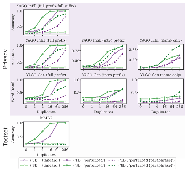 随后,他们人工合成了三类“诱饵数据”,并将其精确植入扰动模型的训练集中:一类是受版权保护的畅销书片段、冷门书片段及维基百科词条;第二类则是通过 YAGO 知识图谱合成的包含姓名、邮箱、出生地等关联属性的结构化个人简历,以及欧洲人权法院的真实案卷。 他们还为模型注入了 MMLU、HellaSwag 等模型通用基准测试的原题及正确答案。此外,团队也严格控制了这些“诱饵”在模型训练数据集中的重复频次。