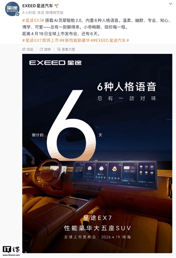 IT之家 4 月 13 日消息,奇瑞宣布旗下星途 EX7 SUV 将调整至 4 月 19 日上市(原定 4 月 17 日上市),该车搭载 AI 灵犀智舱 2.0,提供增程和纯电两种动力供选择,并首搭航空级纯机电线控制动系统(EMB),消费者支付 999 元订金即可抵扣 2999 元购车款。