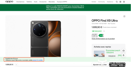 在法国市场,OPPO官网数据显示,Find X9 Ultra 512GB 版本目前已全面售罄,现在下单需等待 64 天方可发货,折合人民币约 13600 元的售价并未阻挡法国消费者的热情。