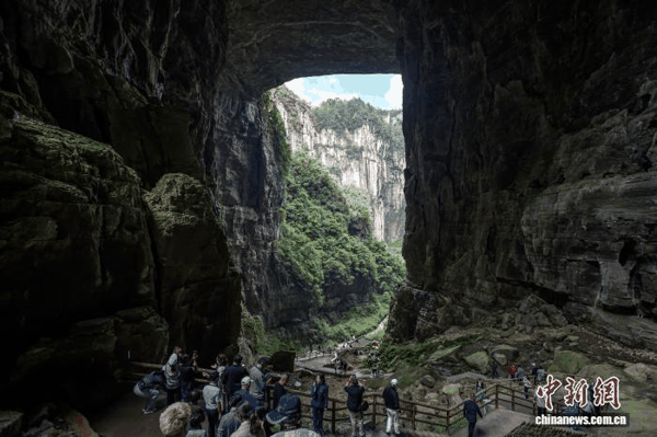 4月16日,武隆天生三桥景区吸引游客拍照打卡。 中新网 记者 何蓬磊 摄
