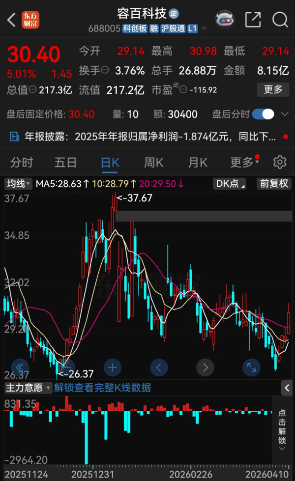 截至4月10日收盘,容百科技股价报30.40元/股,总市值为217.30亿元。
