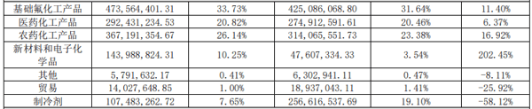 从目前的业务分布来看,基础氟化工产品占营收比超30%,是公司基础业务之一;医药化工产品、农药化工产品、新材料和电子化学品被统一归类为精细化工,占营收比分别为20.82%、26.14%、10.25%,另有制冷剂业务占比为7.65%。