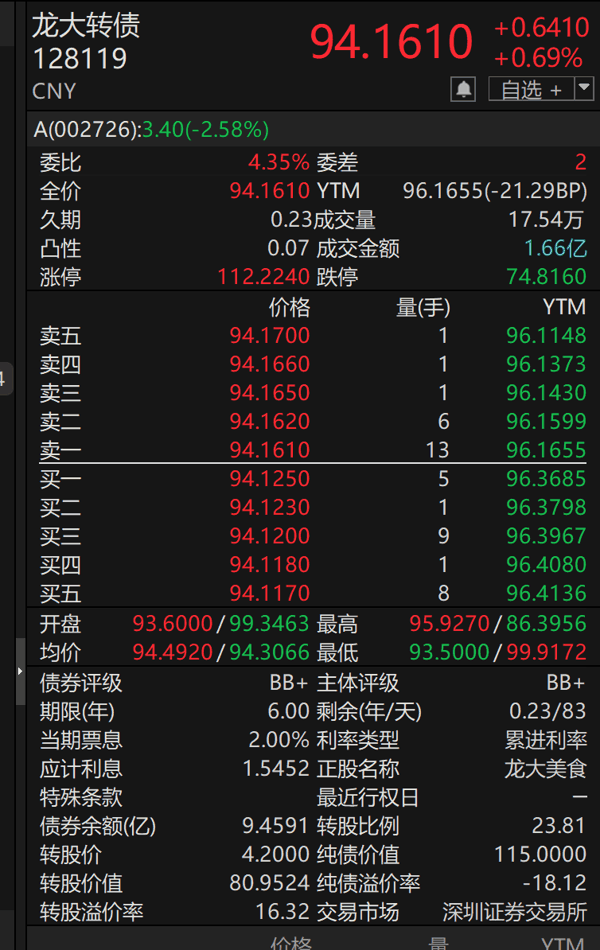不仅如此,宏图转债与龙大转债也跌破了债券面值。截至收盘,宏图转债跌3.28%至93.48元;龙大转债小涨1.37%,至94.8元。
