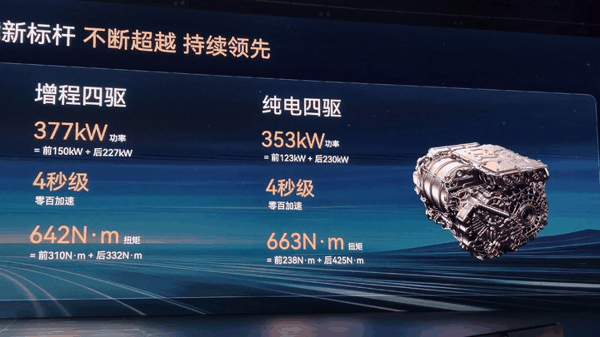 增程版搭载了一台热效率接近 46% 的 1.5T 发动机作为增程器,配合 41.16 度的电池包,CLTC 纯电续航在 225 到 245 公里之间。如果是四驱版本,电机总功率可以达到 374kW。