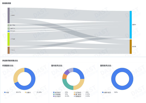 目前中加航线的整体恢复率也不高。根据航班管家的最新统计,中加航线的恢复率只有31.8%,其中中方航司占据近7成的市场份额。