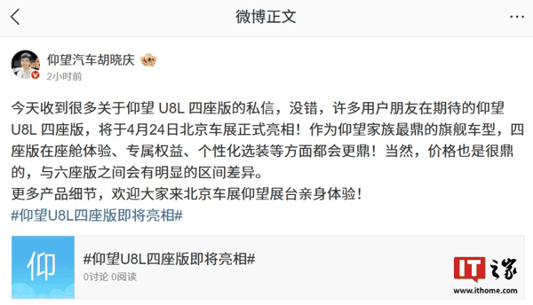 IT之家 4 月 8 日消息,比亚迪仰望销售事业部总经理胡晓庆今日发文宣布, 仰望 U8L 四座版汽车将于 4 月 24 日北京车展正式亮相 。