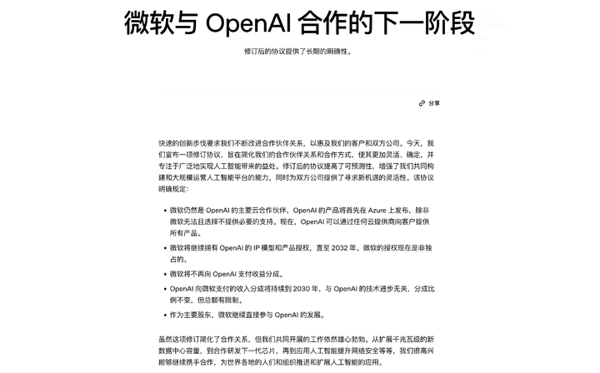 就在刚刚,微软与 OpenAI 联合宣布,双方完成了合作协议的新一轮修订:云合作独家限制正式解除,知识产权授权从独家变为非独家,收入分成也重新划定了天花板。