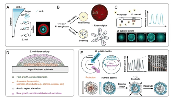 传统观念将细菌视为游离的单细胞,但菌落实际上展现出了类似多细胞生物的复杂协作与分化特性(图1)。在菌落内部,细胞代谢和空间变化会自发形成营养和氧气等微环境梯度。这些梯度与细胞内的全局调控网络(如 c-di-GMP、ppGpp 和特定σ因子)深度耦合,促使细胞分化为具有不同基因表达谱和生理状态的亚群。此外,细菌不仅通过群体感应中的化学信号进行交流,某些细菌(如枯草芽孢杆菌)还能通过钾离子通道传递长距离电信号,从而在群体层面协调竞争性的代谢需求 。这种高度的空间组织进一步催生了复杂的代谢交叉喂养(Cross-feeding)现象,例如大肠杆菌菌落缺氧底部产生并分泌的代谢物(如丙氨酸)可向上扩散,被富氧顶部的细胞作为碳源利用,从而巧妙地平衡了群体的资源消耗与整体生存繁衍。