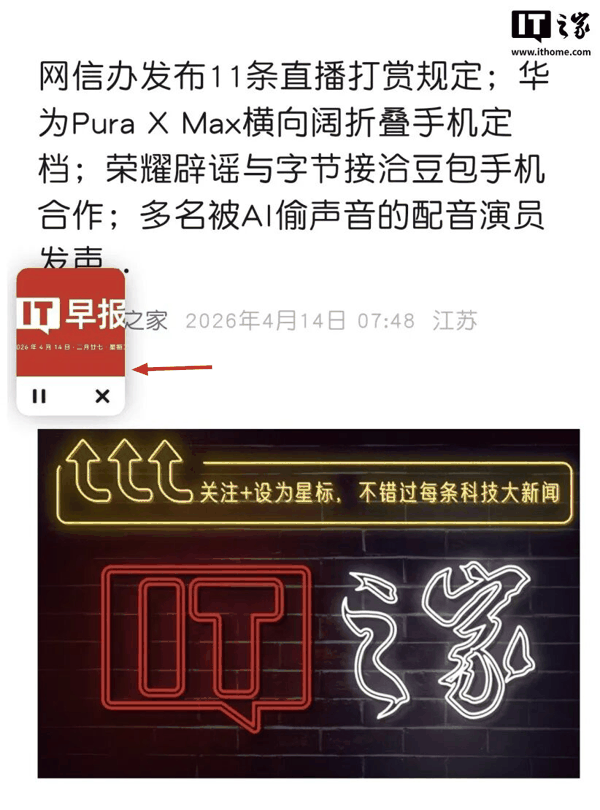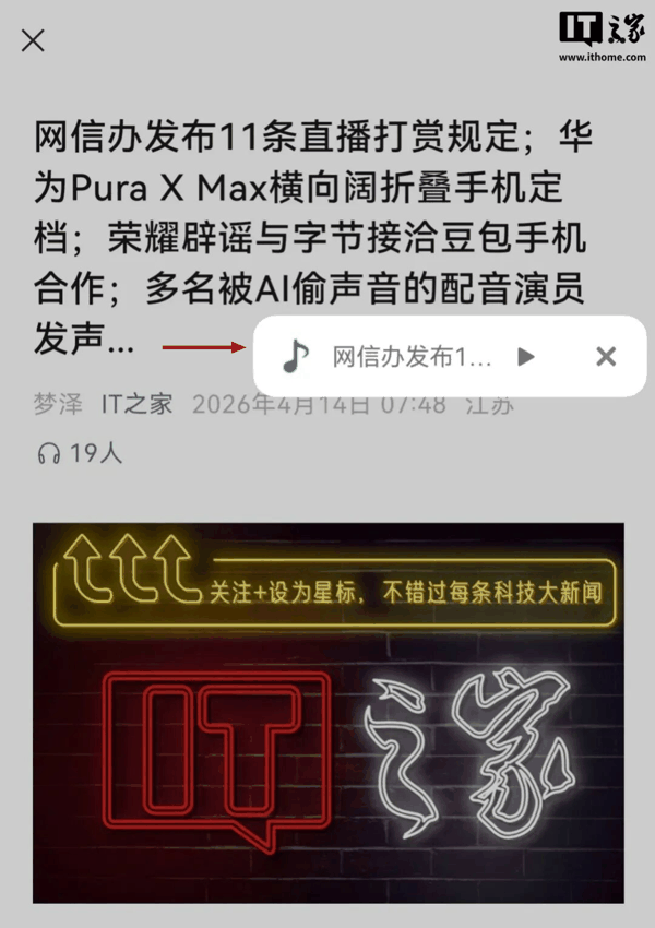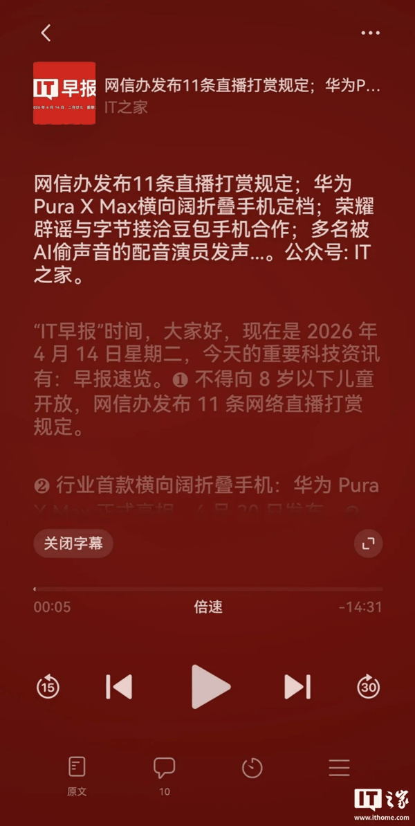 在之前的版本中,于任一公众号文章选择听全文,悬浮窗的样式为上方显示封面缩略图,下方有播放和关闭两个选项。