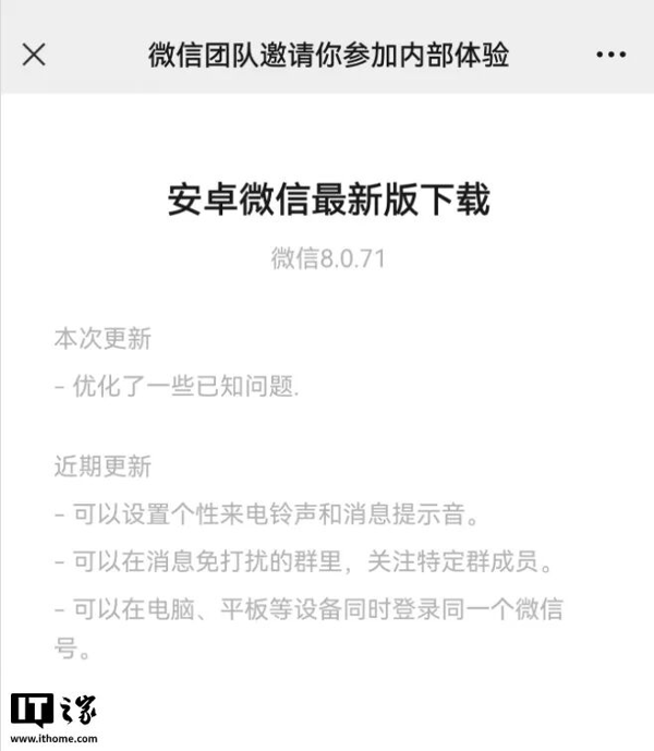 大家在IT之家微信号回复“ 微信 ”两字,即可获取当前最新官方内部版微信下载。