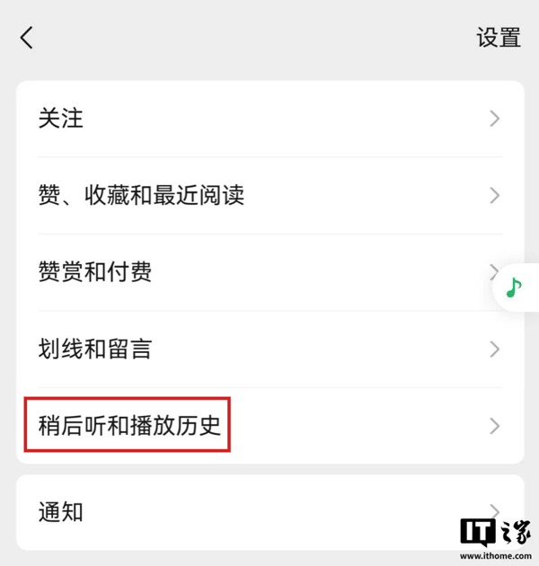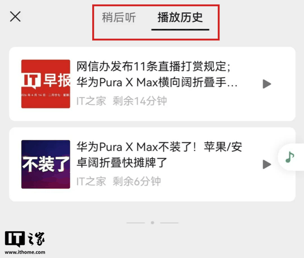 这处上新位于“公众号 - 个人中心”里,出现了“稍后听和播放历史”选项。
