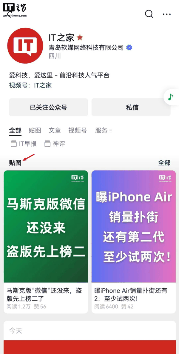 至于另一个方面,则是和“贴图”有关, 贴图在公众号主页的“全部”类别下也有了独立的地盘 ,且每篇贴图以转发卡片的样式展示。