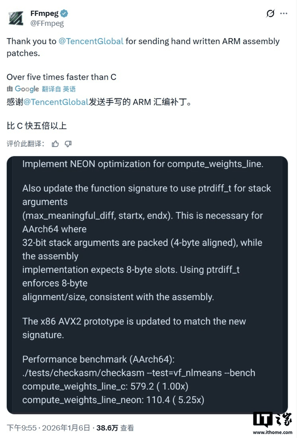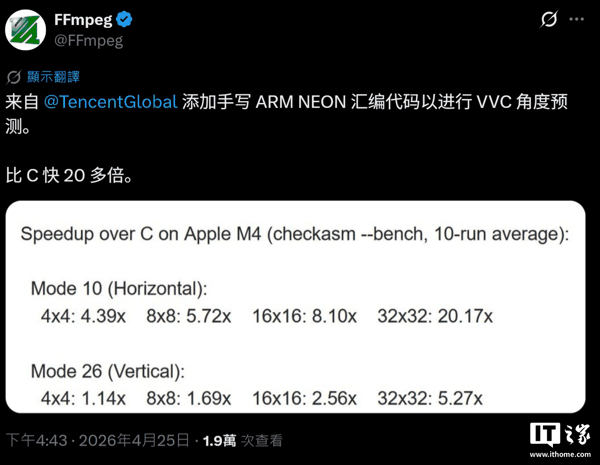 IT之家 4 月 25 日消息,开源多媒体框架 FFmpeg 今天在 X 平台发文,感谢腾讯提交手写的 ARM NEON 汇编代码。