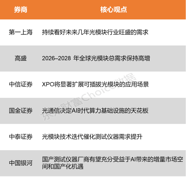 第一上海 证券认为, AI应用 持续强化算力CAPEX逻辑,持续看 好未来 几年光模块行业旺盛的需求,产业的供需格局将持续紧张。 高盛 指出,2026–2028 年全球光模块总需求分别为4.52 亿只、5.28 亿只、5.56 亿只;其中由AI 数据中心 主导的800G 及以上高端市场,2026–2028 年复合年均增速达45%,2028 年需求将升至1.26 亿只。