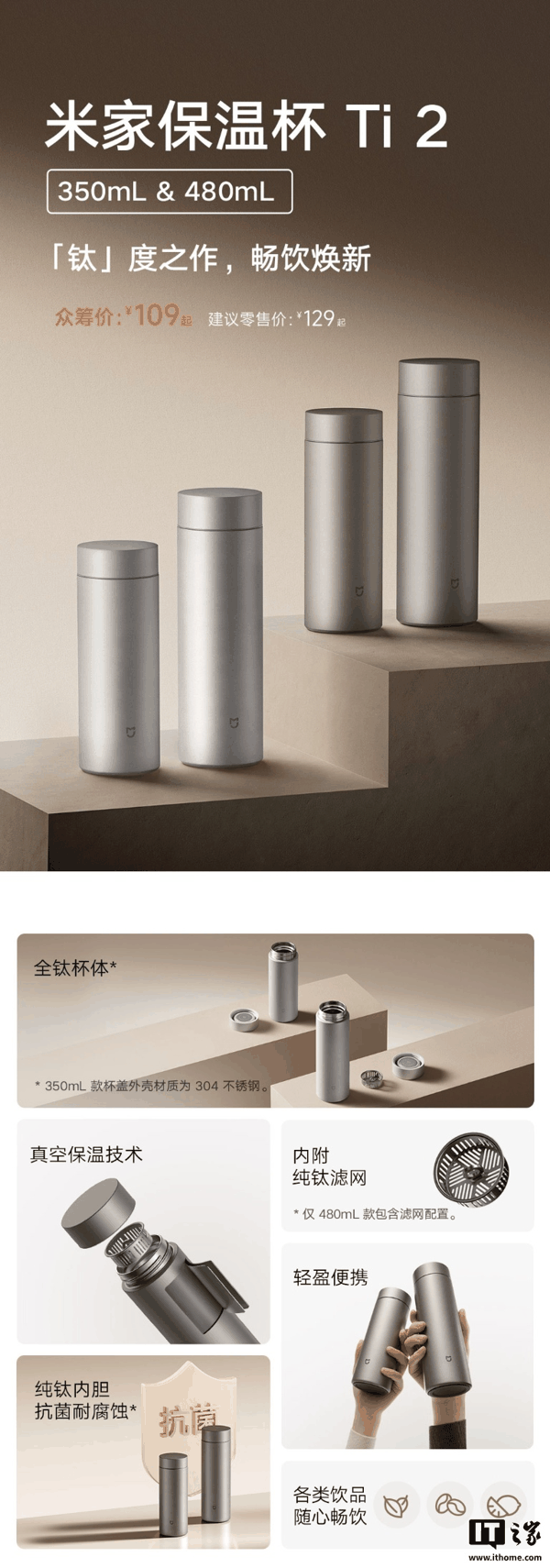 官方介绍称,系列保温杯采用全钛杯体(350ml 为 304 不锈钢材质杯盖),纯钛内胆,配备双层钛真空保温技术,内附纯钛茶滤(仅 480ml)。