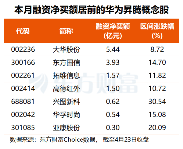 资金方面, 东方财富 Choice数据显示,本月共有8只 华为昇腾 概念股获得融资净买入,其中, 大华股份 获杠杆资金加仓5.44亿元, 东方国信 获抢筹3.93亿元, 拓维信息 、 高德红外 融资净买额均在1.5亿元上下, 兴图新科 、 华孚时尚 、 亚康股份 亦获超3000万元融资净买入。