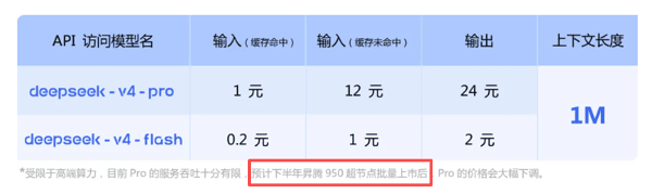 DeepSeek在其推文中也提到,受限于高端算力,目前Pro的服务吞吐十分有限,预计下半年昇腾950超节点批量上市后,Pro的价格会大幅下调。