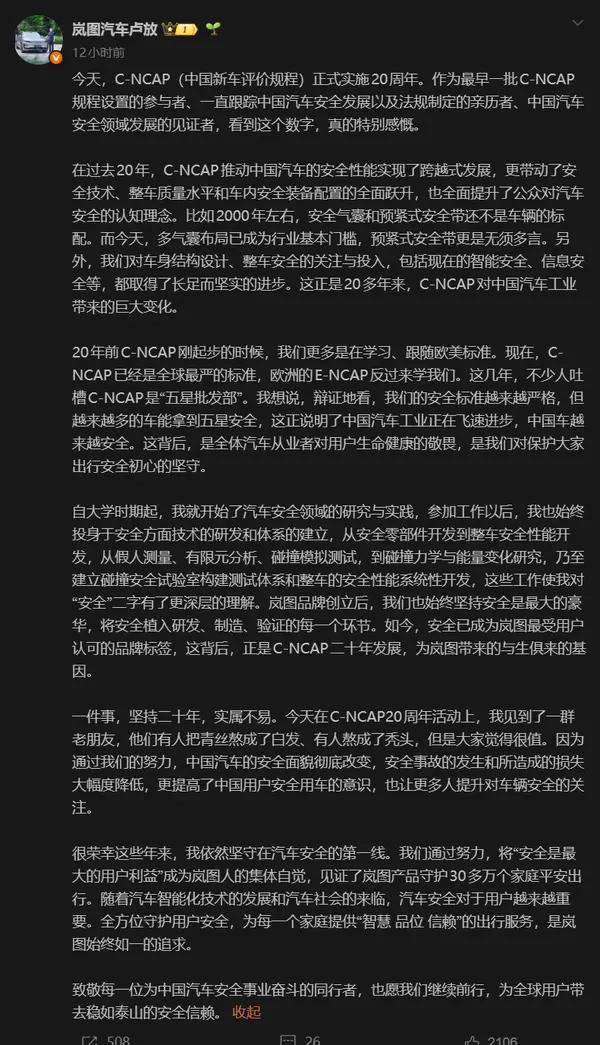 在C-NCAP实施20周年之际,岚图汽车董事长、党委书记卢放用亲历者的视角回顾了中国汽车安全20年的跨越式发展,更对五星评级常态化现象给出了解读。