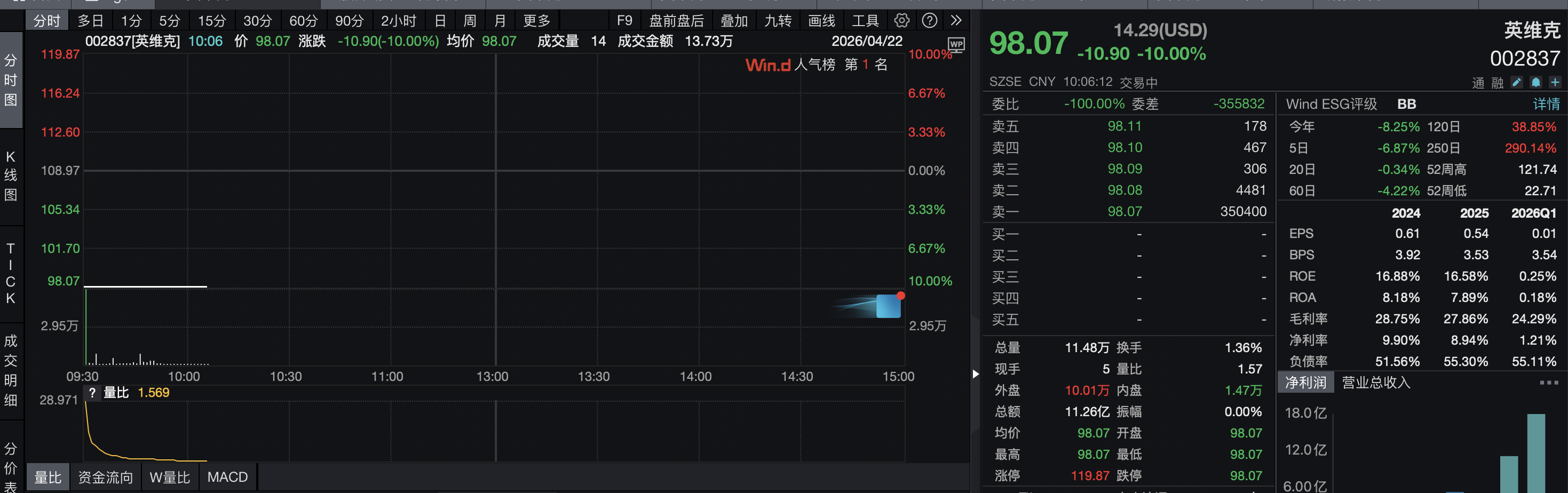 4月22日,英维克(002837)开盘继续跌停,报价98.07元/股。财报发布后,作为A股液冷龙头的英维克已连续两日开盘一字跌停。wind数据显示,英维克今年以来的股价涨幅已转为下跌8.25%。