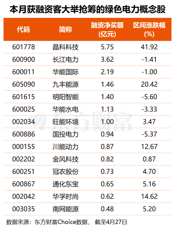 资金层面, 东方财富 Choice数据显示,4月以来,共有27只绿色电力概念股获得超千万元融资净买入,其中, 晶科科技 获杠杆资金加仓5.75亿元, 长江电力 获融资客抢筹3.62亿元, 华能国际 亦获加仓2.19亿元, 九丰能源 、 明阳智能 、 华能水电 融资净买额均在1亿元以上。