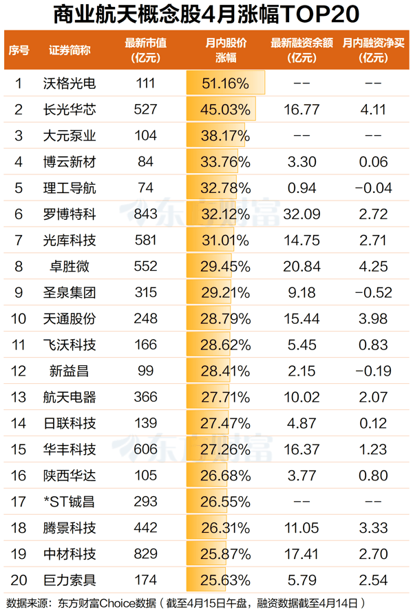 A股方面,在近期商业航天密集消息面刺激下,商业航天概念股整体表现亮眼。4月以来,近300只商业航天概念股中,上涨个股超260只,占比近九成。其中, 沃格光电 涨幅最大,月内涨超51%; 长光华芯 紧随其后,月内涨超45%; 大元泵业 、 博云新材 、 理工导航 、 罗博特科 、 光库科技 等涨幅位居前列,均超30%。