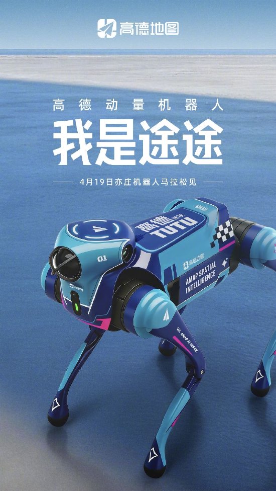 新浪科技讯 4月18日下午消息,高德发布官方海报,首次曝光旗下首款具身 机器人 。这是一款四足机器人,名叫“途途”,官方透露,它将参加4月19日举行的2026北京亦庄人形机器人半程马拉松。