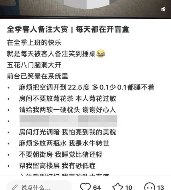 近日,一篇“全季客人备注大赏”的帖文在社交平台引发争议。该账号“全季大连xx 酒店 ”将多名客人的特殊订单备注公开发布,包括“房间不要放菊花茶,本人菊花过敏”“麻烦多放两瓶水,我是水牛转世”“外卖别敲门,放门口,我在修仙勿扰”等内容,配文称“每天被客人备注笑到捶桌”“前台已笑晕在系统里”。