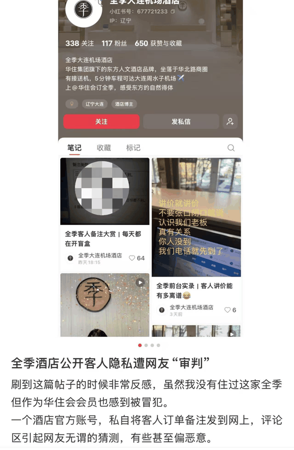 4月16日晚,界面新闻记者搜索相关社交平台,发现涉事账号“全季大连xx酒店”已无法检索到。但记者看到有网友在平台发文表示:“刷到这篇帖子的时候非常反感……一个酒店官方账号,私自将客人订单备注发到网上。”