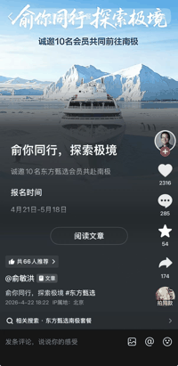 2026-04-22 [俞敏洪] 俞敏洪宣布诚邀10名东方甄选会员共赴南极,预计18天行程;此前在南极旅游发全员信引争议,员工称“老板在南极,员工在加班”