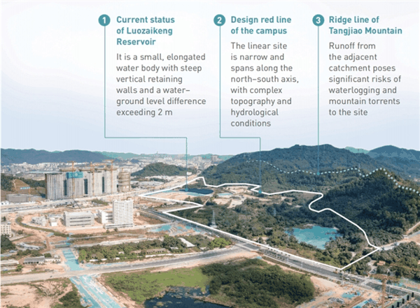 深圳理工大学主校区位于茅洲河上游,地处深圳市光明区与东莞市交界处,占地面积约56hm 2 。校区东临塘角山,生态高度敏感。建于1966年的罗仔坑水库(1.8hm 2 )位于场地北部。该水库最初用于农业灌溉和防洪,自2019年起随着城市发展,其功能已转变为仅用于防洪。