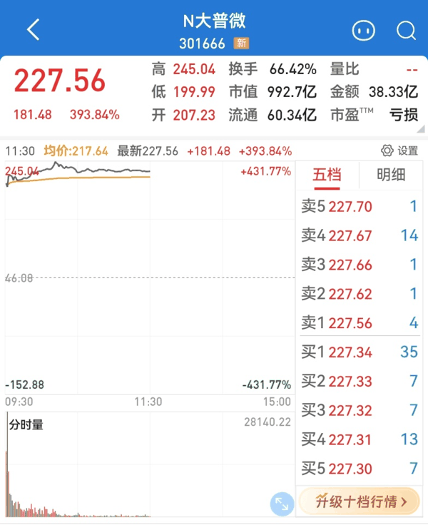 4月16日,大普微(301666)登陆创业板上市,公司上市首日高开349.72%,最大涨幅近430%,总市值一度突破1000亿元,中一签最多可赚超9.9万元。 午盘收报 227.56元/股。