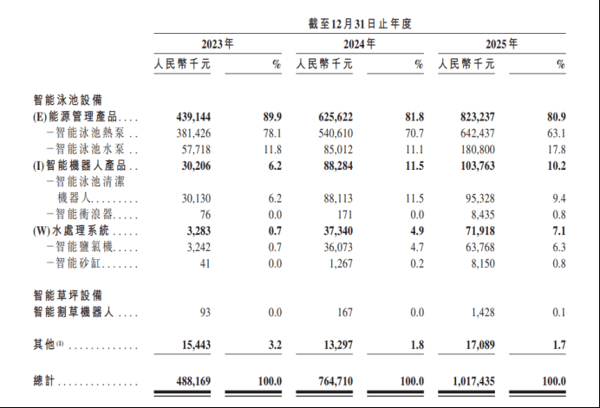 具体而言,能源管理产品主要为智能泳池热泵、智能泳池水泵;智能 机器人 产品为智能泳池清洁 机器人 、智能冲浪器;水处理系统产品为智能盐氯机、智能砂缸。